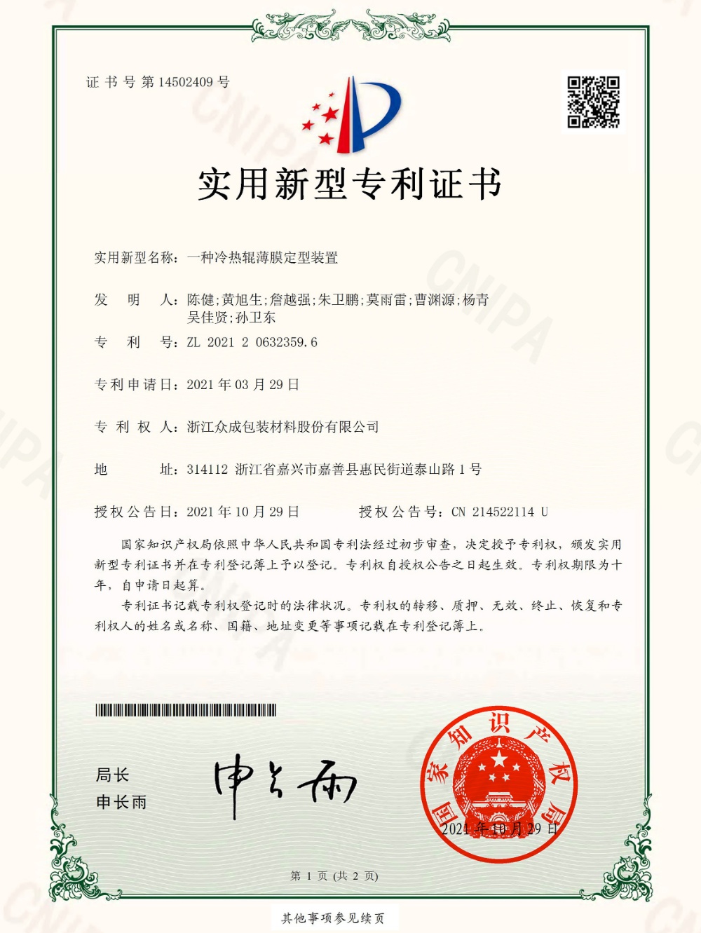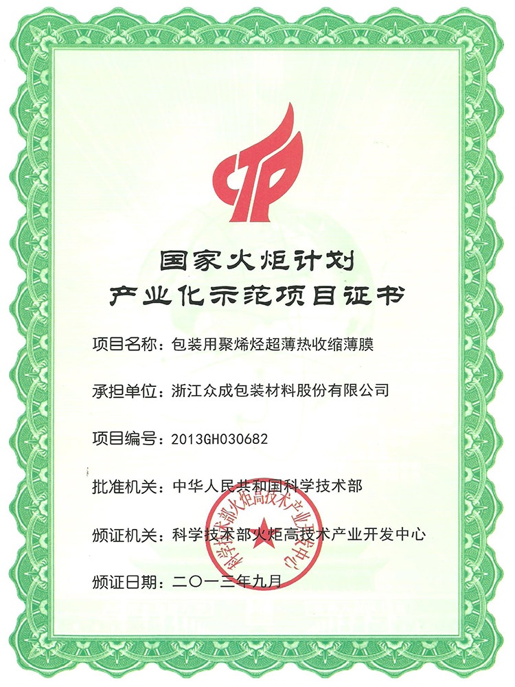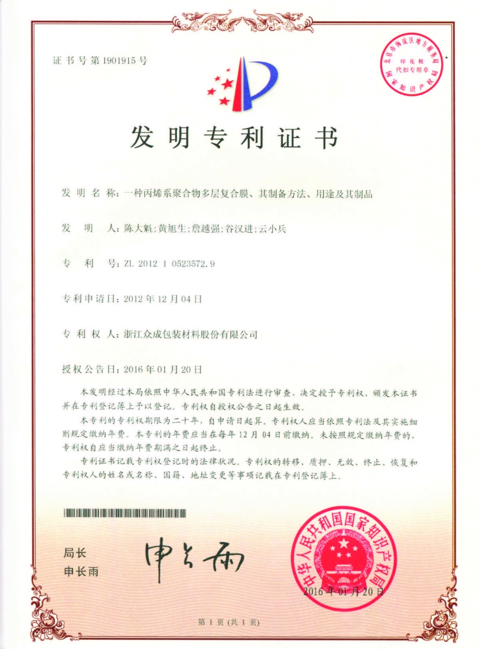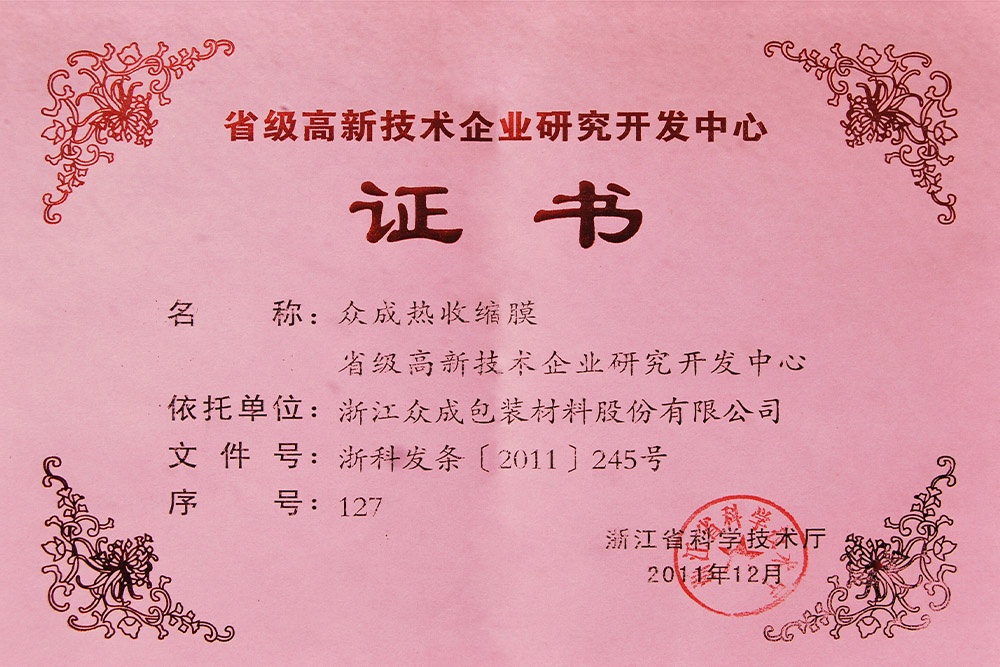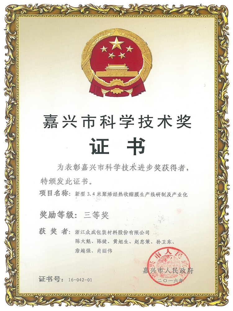 公司秉承“贏在領先”的企業(yè)精神,堅持核心設備自制,不斷在新產品、新工藝上取得創(chuàng)新,已累計獲得知識產權 48 項,其中發(fā)明專利 21 項。先后開發(fā)了POF普通熱收縮膜和POF交聯熱收縮膜,并在此基礎上進一步研發(fā)了聚烯烴高性能(低溫)熱收縮薄膜、聚烯烴高收縮(交聯)薄膜、包裝用超低收縮力熱收縮膜、包裝用聚烯烴超薄熱收縮薄膜等產業(yè)化新產品,多次承擔火炬計劃項目,獲得浙江省科學技術進步獎三等獎4次、嘉興市科學技術獎一、三等獎各1次,嘉善縣科學技術進步獎一等獎2次。